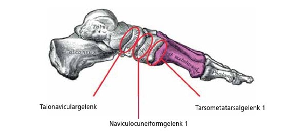 - intrinsische Stabilität der Gelenke des 1. Strahls (Tarsometatarsalgelenk 1, Naviculocuneiformgelenk 1, Talonaviculargelenk)