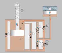 Das hydraulische und das pneumatische System sind über eine gemeinsame Kolbenstange verbunden. Während der Flexion (Abb. 11, rot) fließt Öl von Kammer A über das servohydraulische Ventil 1 und das Rückschlagventil 4a zu Kammer B. Weiterhin strömt Luft aus Kammer C über Rückschlagventil 4c und das aktive quasikontinuierlich arbeitende Nadelventil 3 zu Kammer D. Der Flexionswiderstand lässt sich also in beiden Kreisen vom Mikroprozessor verändern. Wird Ventil 3 zunehmend geschlossen, so wirkt der Pneumatikkolben eher als Luftfeder, indem der Druck in Kammer C erhöht und in Kammer D verringert wird. Die so gespeicherte Energie wird während der folgenden Extensionsbewegung (blau) wieder abgegeben. Dabei gleicht sich der Druck in Kammer C und D wieder an. Bei weiterer Extension wird der Druckanstieg in D über das Rückschlagventil 4d ausgeglichen. Der Extensionswiderstand wird deshalb hauptsächlich durch den Hydraulikkreis definiert. Hier strömt das Öl bei Extension durch das Rückschlagventil 4b und das manuell einstellbare Ventil 2. Die progressive Dämpfung des Extensionsanschlags wird durch die Verlegung des Zuflusses 5 mit dem Kolben realisiert. Der Mikroprozessor kann damit den Extensionswiderstand nicht direkt beeinflussen, sondern passt nur die Extensionsunterstützung an.