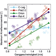 Bei Orion und Rel‑K konnte ein starker Zusammenhang zwischen Kniewinkelmaximum und Ganggeschwindigkeit nachgewiesen werden. Plié2.0 wich am stärksten von einer optimalen Schwungphasensteuerung ab. Die technische Analyse bestätigte, dass beim Plié2.0 keine mikroprozessorgesteuerte Adaption des Flexionswiderstandes möglich ist. Es kann nur zwischen einem hohen Standphasenflexionswiderstand und einem niedrigen Schwungphasenflexionswiderstand umgeschaltet werden. Dadurch lässt sich die starke Zunahme des Knieflexionswinkels mit der Ganggeschwindigkeit erklären. Im Gegensatz dazu weisen C‑Leg, Orion und Rel‑K servohydraulische Ventile zur mikroprozessorgesteuerten Adaption des Flexionswiderstandes auf.