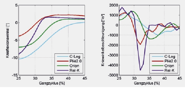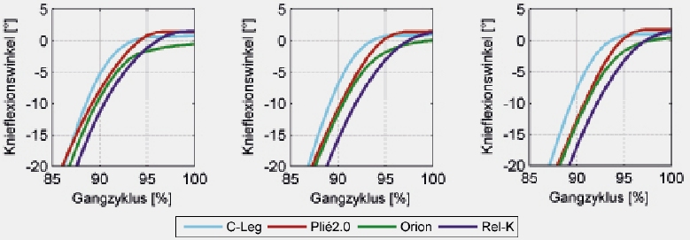 Die folgende Schwungphasenextension ist ein weiteres wichtiges Qualitätskriterium für MPK, da damit das verlässliche Erreichen des Streckanschlages und eine genaue Fußpositionierung beim Fersenauftritt gewährleistet werden. Bei gesunden Probanden wird der Streckanschlag bei rund 97 % des Gangzyklus erreicht. Dieses Kriterium wurde bei allen Geschwindigkeiten vom Plié2.0 und vom C‑Leg am besten erfüllt. Die größte Bewegung im Gelenk kurz vor Fersenkontakt wurde beim Rel‑K gemessen. Das Orion zeigte ebenfalls eine erhöhte Winkelgeschwindigkeit unmittelbar vor dem Auftreten. Dennoch konnten mit beiden MPK keine Unsicherheiten während der Messungen beobachtet werden. Allerdings erfordert der ebene Boden des Ganglabors keine hohe Präzision bei der Positionierung des Fußes, die aber beim Gehen von Treppen und Rampen notwendig wäre.