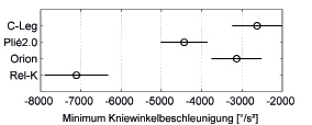 Die Versuchsreihe mit bewusster Standphasenflexion wurde zur Bewertung der Standphasenextensionsdämpfung herangezogen. Eine harmonische Dämpfung sollte sich in einem gleichmäßigen Kniewinkelverlauf widerspiegeln (Abb. 5, links). Dieser wird wiederum durch geringe Kniewinkelbeschleunigungen angezeigt (Abb. 5, rechts), deren Minima in Abbildung 6 ausgewertet wurden. C‑Leg (-2565 ± 1431°/s2) und Orion (-3149 ± 1014°/s2) zeigten die kleinsten Werte und damit das gleichmäßigste Dämpfungsverhalten. Im Vergleich zu Plié2.0 (-4347 ± 1181°/s2) und Rel‑K (-7042 ± 2200°/s2) konnten signifikante Unterschiede festgestellt werden. Während der Versuchsreihen mit dem Rel‑K führte die bewusste Standphasenflexion jedes Mal dazu, dass die folgende Schwungphase nicht eingeleitet werden konnte. Das Rel‑K blieb gestreckt und unterbrach damit die Fortbewegung. Die Unterschiede zwischen den Minima in Abbildung 5 und in der statistischen Auswertung sind im Übrigen durch die punktweise Berechnung der Mittelwertkurven bedingt. Diese verändert die Größe der Maxima und Minima, die Kurvencharakteristik bleibt aber erhalten.