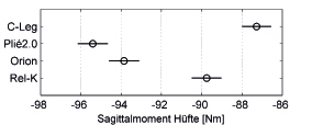 Mithilfe des externen Hüftmoments lässt sich die körperliche Beanspruchung zur Einleitung der Schwungphase bewerten. Das aufzubringende Hüftmoment ist jedoch stark von der Ganggeschwindigkeit abhängig (R2 > 0,5 für alle MPK und Probanden), weshalb im Folgenden nur die mittlere Geschwindigkeit betrachtet werden soll. Um dennoch eine ausreichende Anzahl an Schritten zur Verfügung zu haben, wurden die Daten des im Prothesenaufbau integrierten Messsystems Oktapod verwendet. In Abbildung 7 ist das Minimum des notwendigen Hüftmoments zur Schwungphaseneinleitung dargestellt. Beim Plié2.0 zeigten sich die höchsten absoluten Werte (-95.2 ± 9.5 Nm). Danach folgen Orion (-93.8 ± 10.2 Nm), Rel‑K (-90.7 ± 12.5 Nm) und C‑Leg (-88.7 ± 4.7 Nm) mit signifikant geringeren Werten.