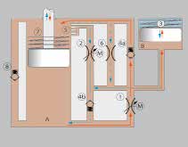 Beim C‑Leg wird der Gelenkwiderstand durch zwei mikroprozessorgesteuerte servohydraulische Ventile erzeugt. So kann der Widerstand stufenlos und unabhängig für die Flexions- und Extensionsrichtung eingestellt und situationsabhängig angepasst werden. In Abbildung 8 ist zu erkennen, dass die Abwärtsbewegung des Kolbens während der Flexion einen Ölfluss (rot) von Kammer A über das servohydraulische Flexionsventil 1 und das Rückschlagventil 4a verursacht. Die Kolbenstange verdrängt außerdem Öl, das in den Ausgleichsbehälter gelangt und dort die Stahlfeder 3 komprimiert. Während der folgenden Extensionsbewegung (blau) wird die dort gespeicherte Energie wieder abgegeben. Die Aufwärtsbewegung des Kolbens führt weiterhin zu einem Ölfluss über das servohydraulische Extensionsventil 2 und das Rückschlagventil 4b. Mit zunehmender Extension wird der Zufluss des Strömungspfads 5 durch den Kolben verlegt. Dadurch ergibt sich eine progressive Endanschlagsdämpfung, die durch die Stahlfeder 7 unterstützt wird. Das Überdruckventil 8 verhindert die Überlastung des Kniegelenks in Flexionsrichtung. Durch das Sicherheitsventil 6 ist auch bei leerem Akku eine langsame Extension des Gelenks möglich.