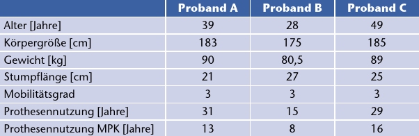 Drei unilateral transfemoral amputierte männliche Probanden nahmen an der Studie teil (Tab. 1). Alle Probanden nutzen ein Genium MPK [a] im Alltag und hatten Erfahrung mit den untersuchten Kniegelenken aus früheren Ganglabortests. Dadurch konnte eine kurze Eingewöhnungszeit realisiert und zusätzlich die Vergleichbarkeit der Ergebnisse sichergestellt werden.