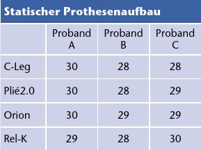 Um die Unterschiede zwischen den MPK hervorzuheben, erstellte ein Orthopädie-Techniker mithilfe des LASAR Assembly [a] identische Prothesenaufbauten für jedes Kniegelenk. Dabei wurden die Vorgaben der jeweiligen Hersteller zum Aufbau eingehalten. Daraufhin folgte die Optimierung des statischen Aufbaus mit dem LASAR Posture [a] nach Empfehlungen von Otto Bock Healthcare (Tab. 2). Die Softwareparameter der Kniegelenke wurden vom Orthopädie-Techniker anschließend nach Herstellerangaben individuell angepasst, um ein bestmögliches Gehen bei allen Geschwindigkeiten zu gewährleisten. Daraufhin konnten sich die Probanden wenigstens 30 Minuten an das Gehen mit der jeweiligen Prothese gewöhnen.
