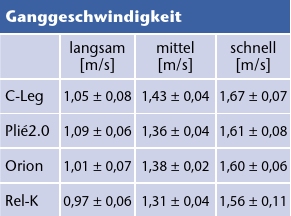 Die Probanden absolvierten mit jedem Kniegelenk vier Versuchsreihen mit 8 bis 10 Wiederholungen. Dabei wurden sie angewiesen, in selbstgewählter mittlerer, langsamer und schneller Geschwindigkeit sowie in mittlerer Geschwindigkeit mit bewusster Standphasenflexion zu gehen. In Tabelle 3 sind die gemessenen Geschwindigkeiten aufgeführt. Die Reihenfolge der MPK wurde randomisiert.