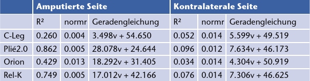 In Abbildung 2 ist das Maximum des Knieflexionswinkels über der Ganggeschwindigkeit für amputierte und kontralaterale Seite dargestellt. Neben allen einzelnen Werten ist zusätzlich die Regressionsgerade eingefügt. Der Anstieg des Kniewinkelmaximums mit der Ganggeschwindigkeit beträgt bei C‑Leg 3,5°/m/s, bei Plié2.0 28,1°/m/s, bei Orion 18,3°/m/s und bei Rel‑K 17°/m/s. Auf der kontralateralen Seite ist der Anstieg mit allen MPK ähnlich und beträgt im Mittel 6,2°/m/s. Das geringe Bestimmtheitsmaß (R2 < 0,1) in Tabelle 4 unterstreicht, dass ein starker Anstieg des Kniewinkelmaximums mit der Ganggeschwindigkeit unnatürlich ist. Beim C‑Leg konnte also die beste Annäherung an das Verhalten des natürlichen Vorbilds erreicht werden.