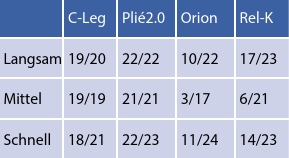 In der folgenden Schwungphasenextension wurde bei allen Geschwindigkeiten mit dem Plié2.0 wie auch mit dem C‑Leg der Streckanschlag vor dem Fersenauftritt erreicht. Speziell bei mittlerer Geschwindigkeit war dies beim Orion und Rel‑K seltener der Fall, was die Positioniergenauigkeit des Fußes verringern könnte.