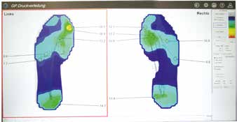 Neben der Analyse der dynamischen Belastung ist es für die Anfertigung der Bettung essenziell, auch die genaue Position der Belastungsstellen am Modell reproduzieren zu können. Dazu wird im Stehen ein Blauabdruck vom Fuß angefertigt, um die Druckspitzen bei voller Belastung zu erkennen. Die Auswertung von Blauabdruck und Druckmessung dienen als Grundlage zur Weiterbearbeitung des späteren Modells und zur Einarbeitung der Entlastungselemente in die Bettung.
