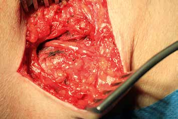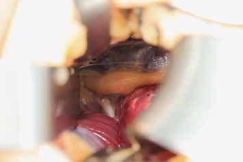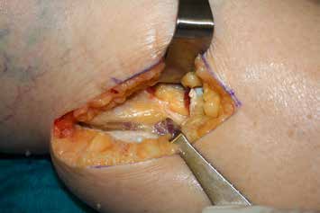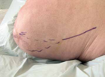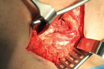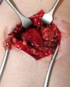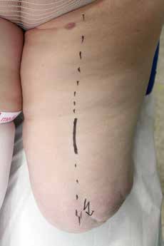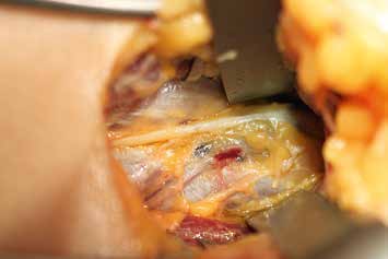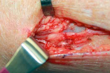 Es erfolgt eine Blockade des Ischias, die erneut eine Besserung im Zuständigkeitsbereich erbringt. Eine entsprechende Operation am Ischiadicus auf der Oberschenkelrückseite (Abb. 10) mit Herauslösen des Nervs aus der Narbe und Versenken in die Muskulatur (Abb. 11) führt zu weiterer Verbesserung der Berührungsempfindlichkeit am Stumpf. Zudem ergibt sich eine leichte Reduktion des Phantomschmerzes in die Großzehe. Das Ergebnis am Saphenus bleibt weiter stabil. Eine Reduktion der Schmerzmedikation ist dennoch nicht möglich. Insgesamt ist eine deutliche Schmerzreduktion erreicht worden; die Patientin kann nun mit einer Prothese versorgt werden.