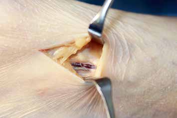Der Peroneus communis kann durch die Bizepssehne bedrängt, von strammen Faszien gegen den Fibulakopf gedrückt werden oder direkt über den Kopf verlaufen. Kritisch ist der Eintritt in die Muskulatur unter demM. peroneus longus (dorsal). Zieht sich dessen Faszie über die Außenseite hinaus in den Spalt zwischen die Muskulatur, kann hier eine Schnürung entstehen (Abb. 5). Je nach Verlauf des Nervs kann eine Kompression gegen den Hals der Fibula auftreten. Der Superficialis kann oberhalb vom Außenknöchel beim Fasziendurchtritt oder jenseits des Durchtrittes durch quer verlaufende Faszienzüge abgeschnürt werden (Abb. 6). Cranial davon ist ein langer subfaszialer Verlauf meist am Septum entlang ungünstiger als ein langer Verlauf zwischen den Muskeln. Der Profundus ist in der Tat selten symptomatisch unter dem Retinaculum extensorum (seltenes sog. vorderes Tarsaltunnel-Syndrom) als vielmehr distal der MT-Basen I/II, wo er von der Sehne des M. extensor hallucis brevis überkreuzt wird 8. Unter den knapp 2000 vom Autor dekomprimierten Nerven an der unteren Extremität finden sich hier am Profundus die stärksten makroskopisch sichtbaren Zerquetschungen (Abb. 7).