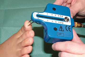 Unter Umständen kann eine Messung der Berührungsempfindlichkeit (Berührungsschwellen) mit einem speziellen Sensibilitätstestgerät (Pressure-Specified Sensory DeviceTM, PSSD, Abb. 8) noch mehr Informationen über den Zustand der Nerven erbringen.