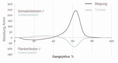 Das „vebitoSCIENCE“-System enthält fünf Messareale, die jeweils die Biege- und die Torsionsbelastung, die auf das Innensohlenmesssystem und respektive auf den Fuß wirken, messen. Sowohl die Biege- als auch die Torsionsbelastung können in zwei unterschiedlichen Richtungen auftreten; die Biegebelastung kann entweder eine Belastung im Sinne einer Plantarflexion oder einer Dorsalextension sein. An der Ferse ist nicht mit einer Belastung im Sinne einer Plantarflexion zu rechnen; die Messareale im Vorfuß zeigen hingegen häufig innerhalb eines Gangzyklus das Auftreten beider Belastungsrichtungen. Abbildung 1 zeigt einen typischen Verlauf der Biegebelastung unter dem MTP I. Positive Werte entsprechen hierbei einer Dorsalextensionsbelastung, negative Werte einer Plantarflexionsbelastung. Für beide Belastungsrichtungen kann ein Maximum bestimmt werden. Die Differenz zwischen diesen beiden Maxima entspricht dem sogenannten Range – er spiegelt u. a. das gesamte Bewegungsausmaß wider.