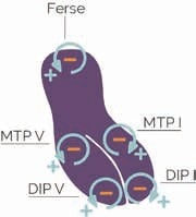 Die Torsionsbelastung ist in Form einer Innen- oder einer Außenrotation möglich. Bezugsachse für die Messareale im Vorfuß ist die Fußmittelachse und für die Fersenmessstelle die Körpermittelachse. Die sich daraus ergebenden Definitionen der Drehrichtungen sind in Abbildung 2 dargestellt. Negative Werte entsprechen dabei einer Innenrotation, positive Werte einer Außenrotation – jeweils darauf bezogen, wie sich der Vorfuß zum Rückfuß verdreht.
