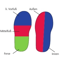 Die Therapie mit orthopädischen Einlagen verfolgt unterschiedliche Ziele. Allgemein werden die Aufgaben von Einlagen als „Stützen“, „Führen“ und „Betten“ beschrieben. Diese Einlagenformen, die als klassische Einlagen in der Festbetragsregelung der PG 08 gelistet sind, wirken im Allgemeinen als passives Hilfsmittel auf den Fuß 5. Mit den sensomotorisch wirkenden Einlagen, die das Ergebnis einer konsequenten Weiterentwicklung der Versorgungsmethode sind, indem sie Kenntnisse der Neurophysiologie und eines physiotherapeutischen Behandlungskonzeptes enthalten, kann die Muskulatur stimuliert oder inhibiert werden. Sensomotorische Einlagen sollen – per gezielter Manipulation des Fußes als sensorisches Organ – eine Reaktion der Bewegungssteuerung provozieren. Dieses Ziel soll sowohl durch eine Um-orientierung der Rückfußstellung als auch durch eine direkte Beeinflussung plantarer myofaszialer Strukturen im Mittel- und Vorfuß verfolgt werden 6. Sensomotorische Einlagen, auch „sensomotorisch wirkende Fußorthesen“ genannt, verfügen über Druckpolster, sogenannte Pelotten, die verschiedene Aufgaben übernehmen: Die mediale Pelotte korrigiert den Rückfuß aus einer Valgusstellung und richtet das Fersenbein aus seiner Pronation auf. Die Orthese wirkt am Scheitelpunkt der Pelotte, dem höchsten Punkt, unterhalb des Sustentaculum tali.