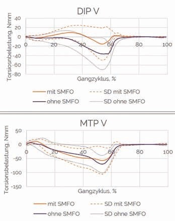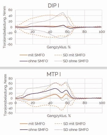 Dass sich nicht nur die Maxima, sondern auch die Verläufe der Torsionsbelastung am MTP I und am DIP V mit und ohne SMFO signifikant unterscheiden, konnte anhand der Untersuchung auf Unterschied über die einzelnen Zeitpunkte nachgewiesen werden. Die Verläufe am MTP I und am DIP V zeigen in den Zeitfenstern, in denen sich die Rotation aufgrund der SMFO umkehrt, signifikante Unterschiede.