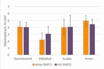 Die Probanden wurden jeweils einmal mit und einmal ohne SMFO beim Gehen auf freier Strecke vermessen, wobei die sensomotorischen Fußorthesen individuell an jeden Probanden angepasst wurden. Die Versorgung erfolgte beidseits in den eigenen Schuhen der Probanden. Alle Einlagen waren mit einer medialen und einer lateralen Pelotte, einer retrokapitalen Erhöhung und einem Zehensteg ausgestattet. Zwischen den beiden Messbedingungen wurden die Unterschiede für den maximalen Druck in den einzelnen Fußbereichen, die maximale Plantarflexion, die maximale Dorsalextension, die maximale Innen- und Außenrotation sowie der Range der Biege- und Torsionsbelastung untersucht. Ausgewertet wurden nur ganzheitliche Datensätze mit mindestens zwei vollständig aufgenommenen Schritten. Somit ergab sich eine Anzahl von 16 auswertbaren Probanden für die Biege- und Torsionsanalyse und von 8 auswertbaren Probanden für die plantare Druckverteilung. Die Untersuchung auf Unterschied wurde bei den Biege- und Torsionsdaten bei gegebener Normalverteilung mittels t‑Test, ansonsten mittels Wilcoxon-Test (Alpha = 0,05) durchgeführt. Die Druckdaten wurden aufgrund des geringen Stichprobenumfangs ausschließlich mittels Wilcoxon-Test analysiert.