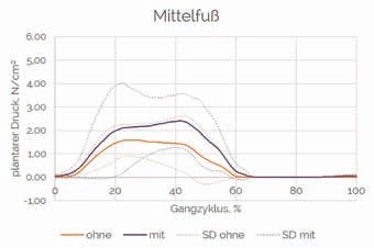 Die Torsionsbelastung an der Ferse, am MTP V und am DIP I weist keine signifikanten Unterschiede in den Maxima oder dem Range auf. Abbildung 5 zeigt die maximal auftretenden Drücke in den einzelnen Fußbereichen. Es gibt keinen statistisch nachweisbaren Effekt der Versorgung hinsichtlich der Druckmaxima in den untersuchten Arealen. Bei Betrachtung der Druckverläufe im Mittelfußbereich ist erkennbar, dass unter Verwendung der Versorgung durchweg höhere Werte während der Standphase auftreten (Abb. 6). Dieser Effekt ist jedoch – möglicherweise bedingt durch die geringe Anzahl an auswertbaren Probanden – nicht statistisch abgesichert.