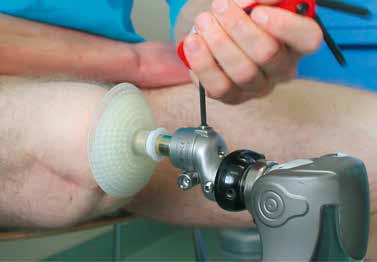 Herr M. S., geb. 1971, hat sich im März 2010 dem ersten Schritt der Operation unterzogen und war davor über 19 Jahre hinweg mit Schaftprothesen versorgt. Dabei erinnert er sich vor allem an die beschwerlich „lange(n) Wege zur Anpassung von Probeschäften bzw. Schäften” und die immer wieder auftretenden Volumenschwankungen des Stumpfes „durch den Abbau der Muskulatur”, was einen korrekten Sitz der Schäfte über längere Zeit vereitelte. Zudem habe er „häufig Haarwurzelentzündungen gehabt”, die durch den Druck der Köcher zustande kamen. Herr M. begrüßt vor allem den durch die Endo-Exo-Prothese „wieder zunehmende(n) Muskelaufbau” des Reststumpfes. Aufgrund einer Läsion des Plexus brachialis mit partieller Lähmung des rechten Arms und der rechten Hand ist Herr M. zwar zusätzlich gehandicapt, jedoch kann er die Endo-Exo-Prothese leicht und selbstständig an- und wieder abbauen, da hierfür nur zwei Schrauben betätigt werden müssen (Abb. 2). Insgesamt sei die Prothese „sehr viel bequemer” für ihn, auch wenn er manchmal Verschleißprobleme mit den äußeren Adaptern gehabt habe. Bei Herrn M. kam es nach einem Sturz zu einer pertrochantären Femurfraktur proximal des Implantates. Er konnte daraufhin mit einem der dynamischen Hüftschraube ähnelnden Osteosynthesemodul versorgt werden, ist seit dem Sturz aber sehr viel vorsichtiger und vermeidet Rotationsbelastungen. Dennoch hat er seit der Versorgung einen Tauchschein gemacht und fährt Fahrrad.