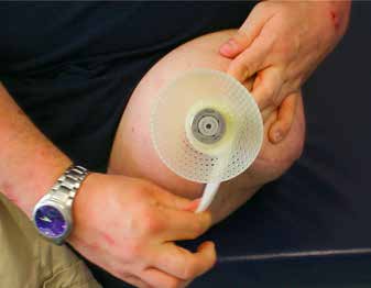 Herrn R. B., geb. 1976, wurde im Oktober 2010 mittels Endo-Exo-Prothese versorgt, nachdem er 10 Jahre lang Schaftprothesenträger gewesen war. Er habe damals jedoch „viel Zeit im Rollstuhl” verbracht, meistens sei er „nach der Krankengymnastik direkt nach Hause” und habe die „Prothese ab(gelegt) und (sich) in den Rollstuhl” gesetzt. Jetzt trage er die Prothese meistens „den ganzen Tag”, er lege sie „morgens an (und) abends ab”. Den Rollstuhl benutze er nur noch zum Duschen, da dies „mit Krücken zu rutschig” sei. Das Sitzen sei erheblich erleichtert, nur gelegentlich verspüre er am Stoma „ein leichtes Ziehen, nicht schmerzhaft, eher unangenehm”. Früher habe das An- und Ablegen der Prothese eine halbe Stunde gedauert, jetzt nur noch Minuten. Probleme habe es nur mit den Ersatzteilen für die äußeren Adapter gegeben, ansonsten sei durch die Sekretion aus dem Stoma manchmal seine Hose etwas feucht, jedoch reiche es aus, wenn er täglich „zweimal die Kompresse” wechsle und das Stoma „einmal täglich ausdusche mit normalen Mitteln” (Abb. 3). Seine anfängliche Angst vor Infektionen habe er überwunden und benutze beim Besuch des Schwimmbades eine Kappe über dem Stoma, jedoch eher, um seine Umgebung nicht mit dem evtl. ungewohnten Anblick zu verunsichern, als aus Angst vor Bakterien. Mittlerweile arbeite er wieder als Kraftfahrer auf einem 40-Tonner. Er bereue, dass er die Operation „nicht früher habe machen lassen”.