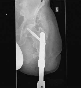 Herr Y. K., geb. 1979, entschied sich für die erste Operation im November 2010 und war davor 3 Jahre unzureichend mit einem Schaft versorgt. Dies lag an seinem sehr kurzen Reststumpf mit obendrein erheblicher Vernarbung. Er habe „alle Schaftsysteme, die es gibt, versucht”, jedoch keine zufriedenstellende Lösung gefunden. Vor allem das Sitzen sei ihm schwergefallen, aber auch „die Hitze im Schaft und wie das riecht” habe er als störend empfunden. Teilweise seien auch die Geräusche bei der Luftentweichung aus dem Schaft „sehr unangenehm” gewesen. Durch das in seinem Fall aufgrund des kurzen Restknochens speziell angefertigte Endo-Exo-Implantat mit proximaler Tragschraube (Abb. 4) habe er nun einen „größeren Bewegungsumfang, und das Sitzen mit der Prothese (auf der Gesäßhälfte der betroffenen Seite, d. Verf.)” sei bequem wieder möglich. Herr Y. arbeitet selbst in der Orthopädie-Technik und bemängelt an der Versorgung, dass teilweise lange Wege unternommen werden müssen, um Ersatzteile der äußeren Bauteile, „die durch Verschleiß ausgetauscht werden müssen”, zu erhalten. Er baut sich selbst äußere Schaumstoffummantelungen für eine bessere Kosmetik, da diese speziell für eine Endo-Exo-Versorgung noch nicht erhältlich seien. Des Weiteren berichtet der Patient, „Bepanthen-Creme (zu) benutzen, um das Stoma weich zu halten” und Hautirritationen zu vermeiden. Seine Körperhygiene beschreibt er als „normal” und ohne größeren Zeitaufwand durchführbar.