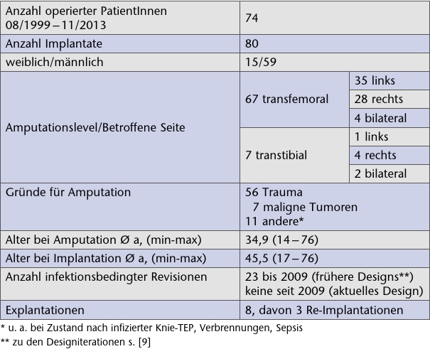 Über die Geschichte der Osseointegration 1 2 3, die Entwicklung der Endo-Exo-Prothese 4 5 6, ihre Weiterentwicklung und die chirurgischen Operationsschritte 7 8 sowie entsprechende Statistiken und Fallzahlen 9 ist in der deutsch- und englischsprachigen Literatur mittlerweile ausreichend berichtet worden, um die Legitimation der Versorgung trotz des ihr innewohnenden Operations- und Infektionsrisikos nachzuweisen 10. In dieser Zeitschrift erschien zuletzt im Mai 2011 ein Übersichtsartikel über die bis dahin vorliegenden Ergebnisse des in Lübeck operierten Patientenguts 11. Mittlerweile wurden in diesem Zentrum 74 Patientinnen und Patienten versorgt; ihre Basisdaten finden sich in Tabelle 1.