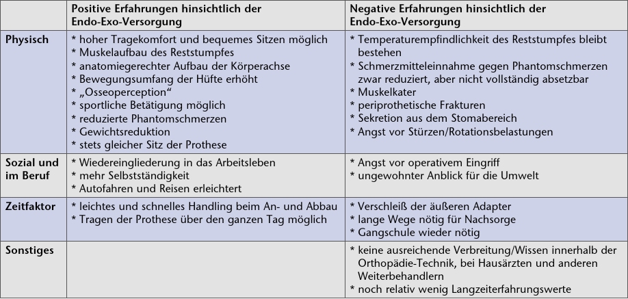 Die Möglichkeit des anatomiegerechten Aufbaus der Körperachse durch die Endo-Exo-Versorgung und damit abnehmende Schmerzen im übrigen Bewegungsapparat bzw. des Achsenskeletts wird von einem Patienten eingehend beschrieben. Überhaupt wird der wieder größere Bewegungsumfang des Hüftgelenkes mit damit einhergehender Erleichterung bei Alltagssituationen und sportlichen Aktivitäten wie Fahrradfahren als sehr positiv empfunden. Hieraus wird auch ersichtlich, dass die in Tabelle 2 angeführten Einteilungskategorien in „Physisch”, „Sozial und Beruf”, „Zeitfaktor” sowie „Sonstiges” nicht völlig unabhängig voneinander existieren, sondern vielmehr ineinandergreifen. Dies ist auch hinsichtlich der negativen Erfahrungen zu berücksichtigen, bei denen vor allem der Angstfaktor hervorzuheben ist. Dieser spielt bei der freiwilligen Entscheidung für eine erneute Operation eine große Rolle, zumal viele Patienten bereits langwierige und teilweise belastende Krankenhausaufenthalte hinter sich bringen mussten. Jedoch kann auch die Angst vor Stürzen, falschen Bewegungen und versehentlichen Rotationsbelastungen mit schlimmstenfalls periprothetischen Frakturen ein alltägliches Hindernis darstellen, das die Betroffenen in ihren Tagesablauf integrieren und meistern müssen.