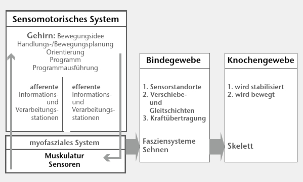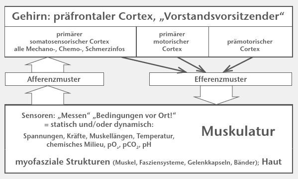 Hierbei sind die Sensoren entweder eigenständige Strukturen wie z. B. Muskelspindeln und Golgiapparate, an denen Nervenfasern sensorischer Neurone enden, oder es handelt sich um spezialisierte Endigungen efferenter Nervenfasern. Der aufsteigende Informationsweg von den Sensoren verläuft über Verarbeitungsstationen zur Hirnrinde, dem primären somatosensorischen Cortex, als dem primären Ankunftsort aller sensorischen Informationen aus der Haut und den myofaszialen Strukturen inklusive des Fasziensystems. Diese und die primäre motorische Hirnrinde zu jeweils 30 % und die prämotorische Hirnrinde zu weiteren 40 % sind dann nach gemeinsamer Konzeptions- und Programmierarbeit mit weiteren Hirnstrukturen wie z. B. den Basalganglien und dem Kleinhirn der Ausgang der absteigenden Wege zur Muskulatur. Daraufhin kontrahiert die Muskulatur mit dem spezifischen Zeit- und Intensitätsmuster der gewollten Bewegung (Abb. 1).
