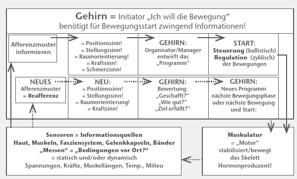 Die veränderten Spannungen in den myofaszialen Strukturen und in der Folge auch in der Haut wie auch die tätigkeitsabhängigen chemischen Konsequenzen insbesondere in den myofaszialen Strukturen werden erneut durch die Sensoren detektiert und die Informationen als neues Afferenzmuster, als Reafferenz, dem Gehirn mitgeteilt. Es ermittelt mit den reafferenten Informationen die neue Körperposition, die neue Körperstellung und die neue Raumposition. Mit Hilfe des Abgleichs zwischen alter und nunmehr neuer Körperposition kann das Gehirn den Haltungs- und/oder Bewegungserfolg erkennen, bewerten und die nächste Phase der Bewegung einleiten.