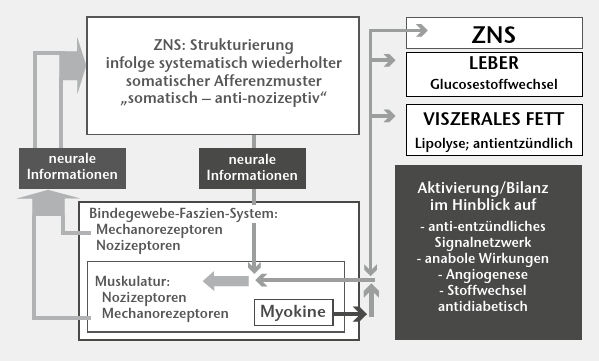 Die Fasziensysteme haben sehr wichtige weitere Funktionen. Sie sind Standort sehr vieler Mechanorezeptoren. Ihre Informationen werden sogar als globales Informations- und Rückkopplungssystem für die Regulation von Haltung und Bewegung angesehen. Dieser Aufgabe können die faszialen Mechanorezeptoren aber nur dann korrekt gerecht werden, wenn die Faszien zugleich ihrer Funktion als Verschiebe- und Gleitschichten nachkommen können. Eine chronische Inaktivität als Ursache von Defiziten des Bewegungskönnens und der Bewegungsvielfalt, der sensomotorischen Koordination, führt dazu, dass die Fasziensysteme als Verschiebe- und Gleitschichten kaum bis gar nicht mehr genutzt werden. Das Ergebnis sind Verklebungen und „Verfilzungen”. Damit sind diese Strukturen auch als Sensorstandorte „insuffizient”. Gleichzeitig sind die konditionellen Fähigkeiten reduziert. Die verminderte Ausdauerfunktion ist Synonym für eine reduzierte und chronisch gestörte Mikrozirkulation und somit für eine nicht bedarfsgerechte Sauerstoffversorgung. Dies führt in den Fasziensystemen zu einem sauren und entzündlichen Stoffwechselmilieu.