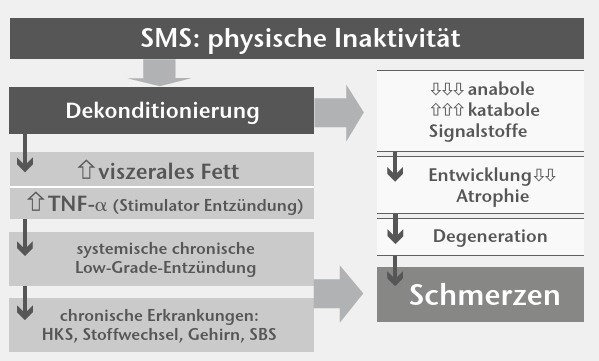 Es muss hervorgehoben werden, dass der Strukturaufbau wie auch der Strukturabbau aktive und immer über Signalstoffe geregelte Prozesse sind (Abb. 7). Systematische Aktivität mit allen Belastungsformen (Lernen, Ausdauer, Kraft) sorgt unter Vermittlung der Stimulation anaboler Hormonsysteme dafür, dass die Körperstrukturen erhalten, gepflegt und je nach Dosierung der Aktivität weiter aufgebaut werden. Es entsteht eine somatischadaptive, anti-involutive, anti-entzündliche und anti-nozizeptive Körperstruktur. Das Gegenteil entwickelt sich durch eine chronische Inaktivität. Das Ergebnis ist nach Jahren eine „atrophische, involutive, degenerative mit Übergang zur pathologischen, pro-entzündliche und pro-nozizeptive Körperstruktur” (Abb. 6 u. 7, 8). Der Vermittler ist die durch das viszerale Fettgewebe vermittelte systemische geringgradige Entzündung 9.