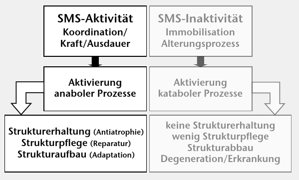 Alle Bewegungsleistungen von der einfachsten – wie z. B. dem Gehen – bis zu den schwierigsten – wie z. B. denen eines Turners –, aber auch die Sensomotorik des Sprechens, Singens und Handwerkens basieren auf der Funktion des SMS 1. „Senso-” stammt von den Sensoren, also der ständigen Informationsaufnahme, und „motorisch” stammt von „Motor”, der Leistungsabgabe durch die Muskulatur. Dazwischen ist die Zentrale, das Nervensystem. Das funktionell nicht teilbare und bei allen Bewegungen immer als Gesamtsystem aktive SMS wird somit durch 3 Strukturbestandteile gebildet. Es sind die Sensoren, das periphere und zentrale Nervensystem sowie die Muskulatur.