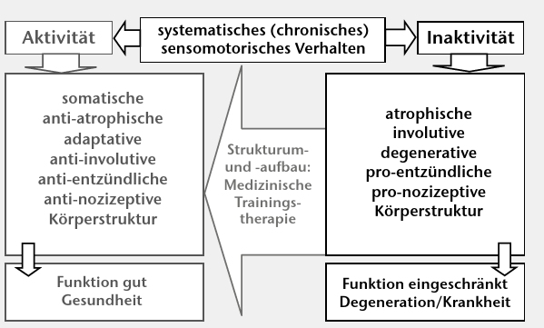So modifizieren die medizinischen Gegebenheiten, charakterisiert durch die Erkrankung selbst, den bisherigen Verlauf und damit den Stand der Erkrankungsprozesse, die Inhalte und Dosierungen aktiver Therapieformen. Eines ist aber sicher: Es gibt keine chronische Erkrankung, die nicht aktive Therapieformen erfordert. Nur eine angepasst dosierte, systematische medizinische Trainingstherapie als langfristige Therapieform ist in der Lage, eine atrophische, degenerative, pro-entzündliche und pro-nozizeptive Körperstruktur in Richtung einer somatischen, anti-atrophischen, antientzündlichen und anti-nozizeptiven Körperstruktur zu beeinflussen. Das Ausmaß der möglichen Wirksamkeit ist natürlich vom Stand der Komplexität und dem Stand der krankhaften Prozesse abhängig, denn eine vollständige Wiederherstellung der gesunden Struktur und Funktion vermag auch eine Trainingstherapie nicht. Einen wesentlichen positiven Einfluss auf das Befinden und die Funktionsfähigkeit hat sie aber allemal. Die Bereitschaft des Patienten, die physische Belastung zum ständigen Bestandteil des Lebensstils zu machen, ist hierbei die Schlüsselfunktion. Diese muss aber immer auch durch eine kompetente medizinische, trainingstherapeutische Anleitung und Kontrolle der Dosierung begleitet sein.