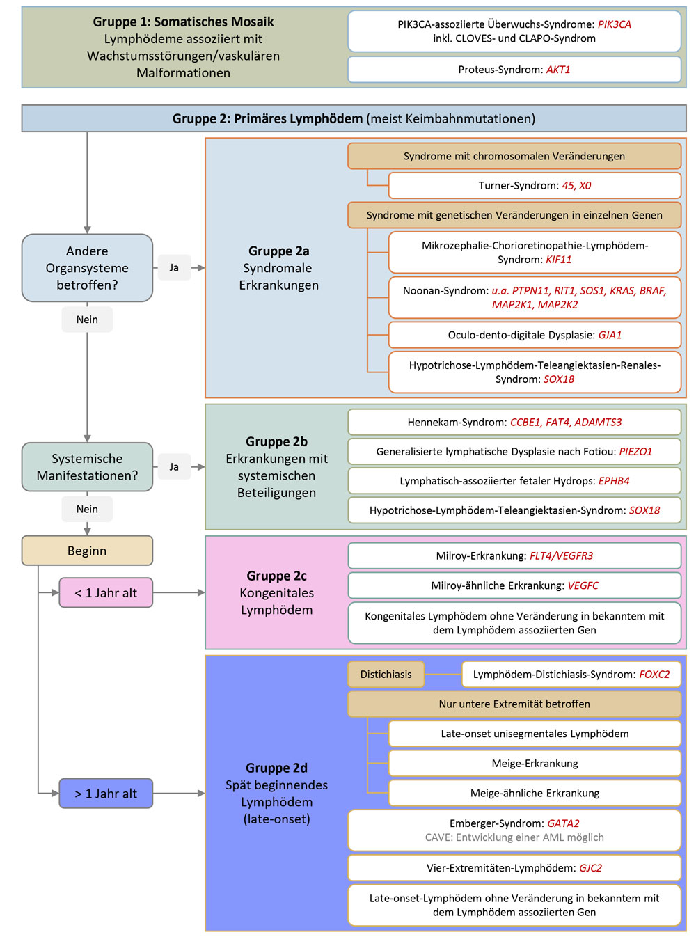 Im Gegensatz zu chromosomalen Veränderungen können primäre Lymphödeme dieser Gruppe auch durch Veränderungen in einzelnen Genen verursacht werden. Die Diagnostik erfolgt entsprechend einem festgelegten Stufenschema.