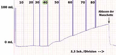 Bei diesem Test liegt der Proband auf dem Rücken, wobei die Ferse auf einem Schaumstoffblock abgestützt ist, um Platz für die Unterschenkelsensormanschette zu schaffen 7. Am Oberschenkel wurde eine 18 cm breite Kompressionsmanschette (konturierte Oberschenkelmanschette CC17, Hokanson®, D. E. Hokanson, Inc., Bellevue, Washington, USA) angelegt und an eine Druckluftpumpe (VenaPulse®, ACI Medical LLC, San Marcos, Kalifornien, USA) angeschlossen. Die Druckluftpumpe verfügt über einen bedarfsgesteuerten, raschen Füll- bzw. Ablassmechanismus, um den vom Bediener frei wählbaren Luftdruck einzustellen. Die Oberschenkelmanschette wird in 10-mmHg-Schritten stufenweise aufgepumpt. Bei jedem folgenden Aufpumpvorgang wird die Zunahme des Unterschenkelvolumens mit dem Schreiber (Abb. 3) aufgezeichnet. Der inkrementelle Druck der Oberschenkelmanschette, der die maximale Volumenzunahme bewirkt, wird als IPMIV-Parameter (IPMIV= incremental pressure causing the maximum increase in volume) in die Tabelle eingetragen. Er steht für den Druck, bei dem der Kompressionsstrumpf nachgibt und sich am stärksten ausdehnt. Zu diesem Zeitpunkt kann der Kompressionsstrumpf die Erweiterung des Unterschenkels nicht länger kontrollieren.