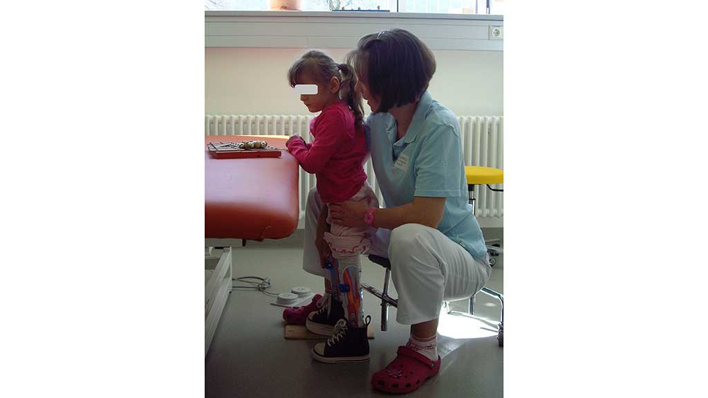 Annas Röntgenbild zeigte nach sechs Wochen eine gute Konsolidierung: Im Rahmen der Therapie begann die Fünfjährige mit dem Stehen und der Gewichtsverlagerung im Stand (Abb. 11). Parallel zur Vertikalisation erfolgten die Orthesenkontrolle und ‑nachpassung, zudem wurde der NF-Walker überprüft.
