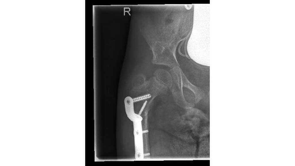 Im Frühjahr 2012 erfolgte dann die umfangreiche Hüftoperation: Adduktorentenotomie beidseits, Psoas-Tenotomie rechts, offene Reposition und DVO und Pfannendachplastik nach Dega mit Surfixplatte rechts (Abb. 8).