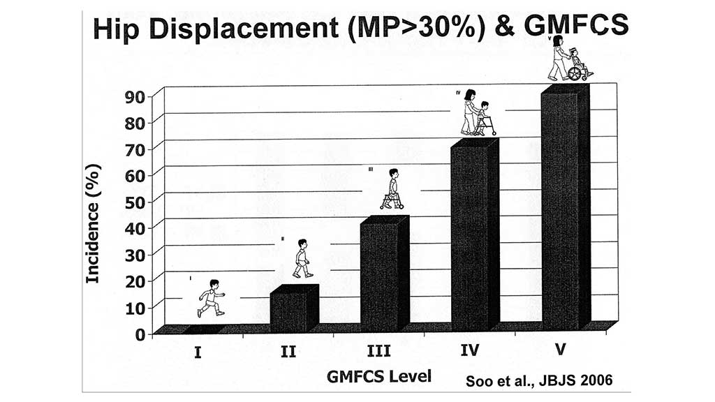Untersuchungen zeigen auf, dass ein Zusammenhang zwischen der Form der Ausprägung der ICP nach GMFCS, Gross Motor Function Classification System, und dem Auftreten von Hüftfehlbildungen besteht (Abb. 2). Die globale Reifungsverzögerung und das Ausmaß der Tonuserhöhung sind mit dafür verantwortlich, dass sich schwer betroffene Kinder (GMFCS VI, V) nicht ausreichend gegen die Schwerkraft stabilisieren und sich somit auch nicht aktiv aufrichten können. Der formende Reiz zur Entwicklung normaler Hüftgelenke fehlt dadurch (Tab. 2).