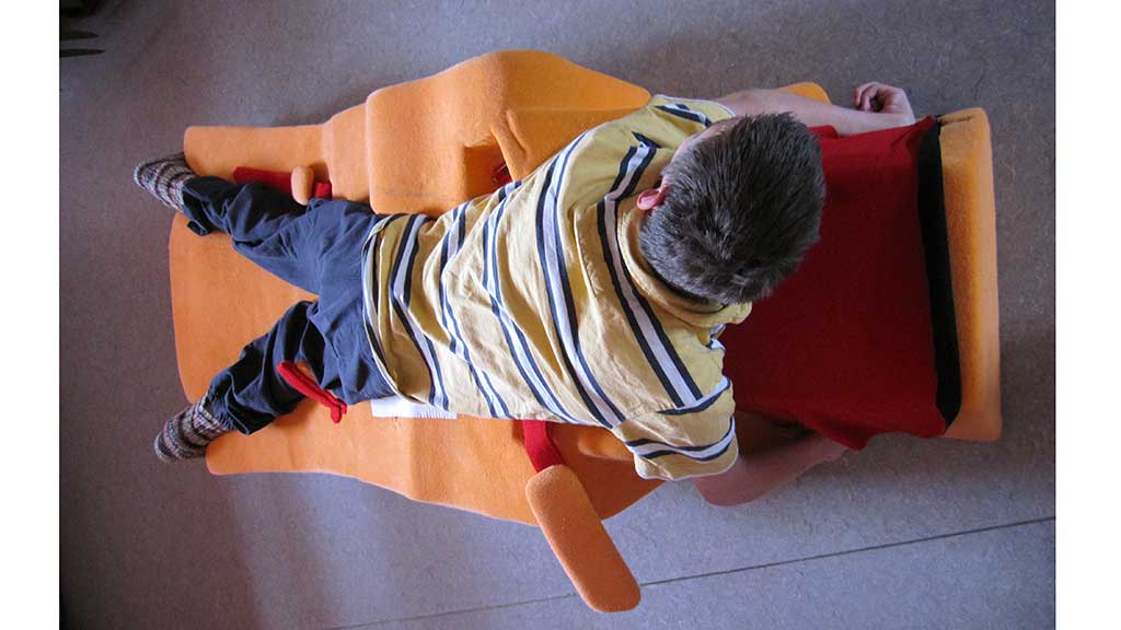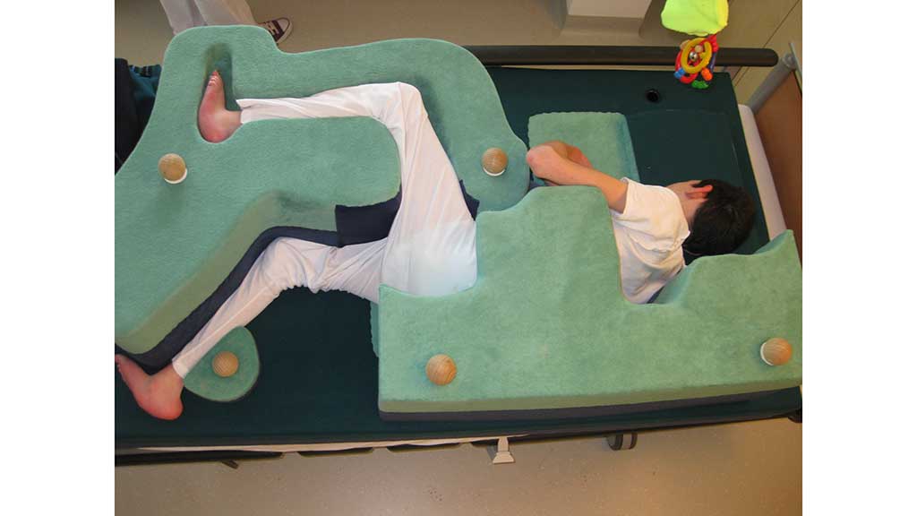 Einen weiteren Baustein der konservativen Behandlung bildet die Lagerungsbehandlung in Abduktion. Entsprechende individuelle Lagerungselemente können für die Rücken‑, Seit- und Bauchlage (Abb. 3 u. 4) gefertigt werden. Durch eine Abduktion von 15 bis 20° wird sichergestellt, dass die Hüftgelenke zentriert in der Pfanne eingestellt werden. Alternativ können entsprechende dynamische Lagerungsorthesen (Abb. 5) eingesetzt werden. Diese werden meist von den Patienten besser akzeptiert, da sie eine aktive Beweglichkeit in Knie- und Hüftgelenken zulassen und sich die Patienten damit i. d. R. auch selbstständig drehen können.