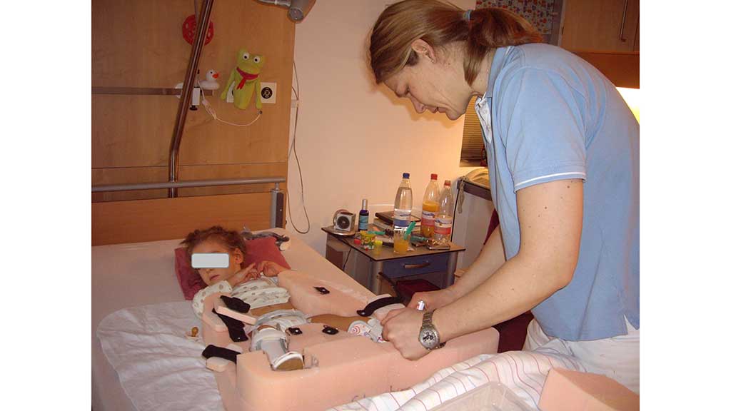 Eine genaue Elternanleitung erlaubte es der Mutter, Annas Hüfte regelmäßig durchzubewegen und sie selbstständig mehrmals am Tag für einen festgeschriebenen Zeitraum in den Rollstuhl zu setzen.