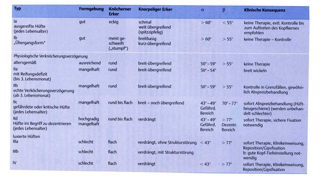 Zusätzlich zu einer ausführlichen Anamnese und einer Befunderhebung dient seit 1996 das Sonografie-Screening in U3 der Diagnosestellung. Die Klassifikation erfolgt nach dem österreichischen Orthopäden Reinhard Graf und erlaubt eine Feststellung und Einteilung des Schweregrades, aus welchem sich wiederum die entsprechende Therapieform ableiten lässt. Zur Beurteilung des Pfannendachs entwickelte Graf als Beurteilungshilfe zwei Messwinkel: den Pfannendachwinkel Alpha und den Knorpeldachwinkel Beta (Tab. 1, Abb. 1) 3.