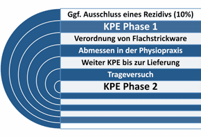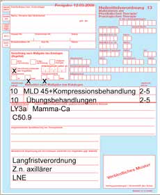 Im iBB erhalten alle Patientinnen mit einer Sentinel- oder axillären Lymphknotenexstirpation (SNE/ALNE) postoperativ manuelle Lymphdrainage, obwohl zu diesem Zeitpunkt noch keine Manifestation des sekundären Lymphödems zu erwarten ist. Allerdings geschieht dies unter dem Gesichtspunkt des posttraumatischen (Lymph-)Ödems, sodass dadurch, ähnlich der unfallchirurgischen und orthopädischen Behandlung, Schwellung und Schmerzen minimiert und der Heilungsprozess beschleunigt werden soll. Patientinnen mit ALNE erhalten nach der Entlassung noch eine Heilmittelverordnung über 10-mal MLD (ggf. mit Kompressionsbehandlung) plus 10-mal Übungsbehandlungen 2- bis 5‑mal pro Woche, sofern sie in die Brustsprechstunde überwiesen wurden (Abb. 7). Durch die Möglichkeit der Langfristverordnung bei onkologischen Diagnosen ist auch eine so intensive Behandlungsphase wie die KPE Phase 1 (ambulant meist 2 Wochen lang 5‑mal pro Woche) budgetneutral. Nur die Materialien für die Kompressionsverbände (Kurzzugbinden etc.) belasten die verordnenden Kollegen einmalig (Binden verbleiben bei der Patientin und werden bei der nächsten KPE wiederverwendet). Regelmäßig getragene Kompressionsware ist nach 6 Monaten „abgetragen“ und muss erneuert werden. Patientinnen, die ambulant nicht vorgestellt wurden, erhalten eine entsprechende Empfehlung für die niedergelassenen Kolleginnen und Kollegen.