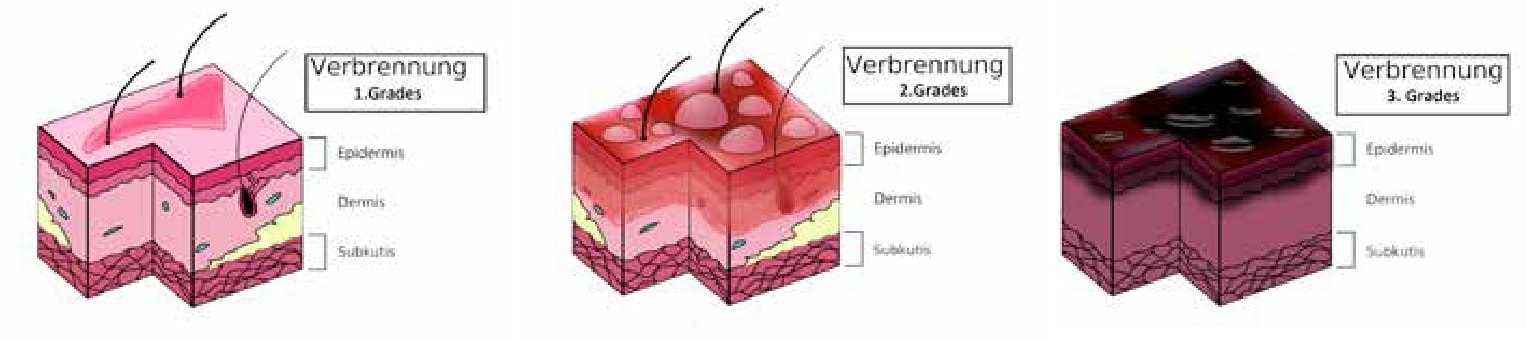 | Grad 3 | Epidermis + Dermis | trockene Blasenreste auf weißem Wundgrund, keine Schmerzen | OP-pflichtig | |