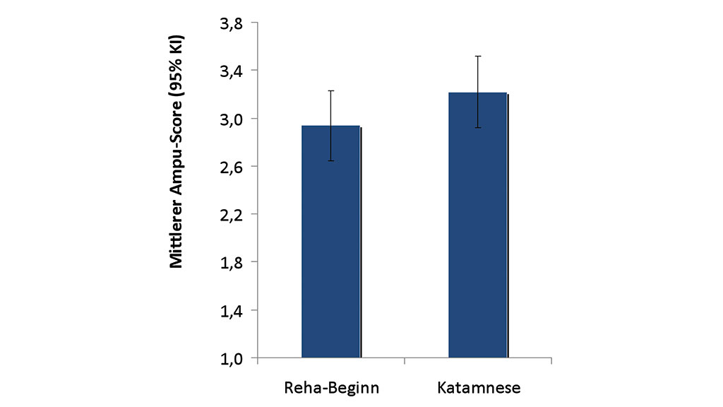 Bei der Erhebung des Amputationsscores zeigte sich zu Beginn der Rehamaßnahme ein mittlerer Mobilitätsgrad von 2,94. Zum Katamnesezeitpunkt konnte der mittlere Mobilitätswert auf 3,22 verbessert werden (Abb. 4).