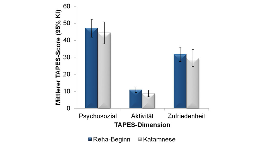 Erreicht man beim TAPES 1 (psychosoziale Anpassung) einen hohen Punktwert (maximal 51 Punkte möglich), so ist von einer guten psychosozialen Anpassung auszugehen. Bei der Eingangsuntersuchung wurde ein mittlerer Wert von 47,09 Punkten ermittelt, am Ende der Prothesenrehabilitation von 44,35 Punkten. Zwar ist damit nominell ein schlechterer Punktwert festgestellt worden, jedoch sind diese Ergebnisse bei noch geringer Fallzahl nicht als endgültig anzusehen. Mehr noch bedingt dieser vergleichsweise geringe Unterschied keinen signifikanten Unterschied in der psychosozialen Anpassung.
