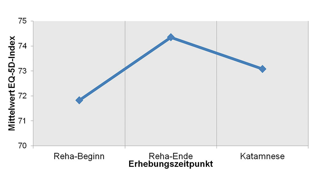 Der Ausgangswert des EQ-5D-Index wurde im Mittel mit 72 Punkten ermittelt und steigerte sich zum Ende der Rehabilitation auf mittlere 74 Punkte. Mindestens 6 Wochen nach dem Rehaende fiel der Wert auf 73 ab, was allerdings weiterhin über dem ermittelten Wert bei der Eingangsuntersuchung der Prothesenrehabilitation lag. Der höchstmögliche EQ-5D-Indexwert, welcher für den bestmöglichen Gesundheitszustand steht, ist 100 (Abb. 6).