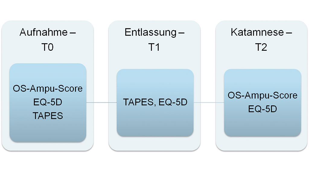Bei der Aufnahme wurden der Amputations-Score, der EQ-5D sowie der TAPES erhoben. Am Entlassungstag wurde von den Teilnehmern erneut der TAPES und der EQ-5D ausgefüllt. Weiterhin wurden mindestens 6 Wochen nach Beendigung der Rehabilitationsmaßnahme der Amputations-Score sowie der EQ-5D neuerlich erfasst (Abb. 3) 6.