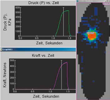Um gezielt Aussagen zu Materialeigenschaften unter realen Lastfällen wie Gehen oder Laufen treffen zu können, wurde in Zusammenarbeit mit dem Institut für Biomechanik der Deutschen Sporthochschule Köln eine darauf ausgelegte Prüfapparatur entwickelt (Abb. 3). Die Prüfparameter wurden durch Messungen an Diabetikern mit erhöhtem Ulkus-Risiko erhoben (Abb. 4). Prüfungen, die die Belastung von mehreren Kilometern simulieren, ermöglichen zusammen mit der Messung der Erholungsmöglichkeit des Materials die Bestimmung der Dauerelastizität.