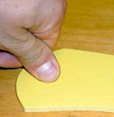 Ein Ergebnis lautet, dass nicht der erste, oftmals weiche Effekt eine dauerhaft gute Druckumverteilung gewährleistet. Mit der subjektiven Bewertung der gefühlten Weichheit werden nicht die notwendigen funktionellen Materialeigenschaften ermittelt, die bei Typ-II-Diabetikern plantar notwendig sind. Der häufig in der Praxis benutzte Materialtest (Abb. 6) oder eine alleinige Beschreibung des Materials mittels Shore-Härte reicht zum Aufbau einer diabetesadaptierten Fußbettung aus unserer Sicht nicht aus 15.