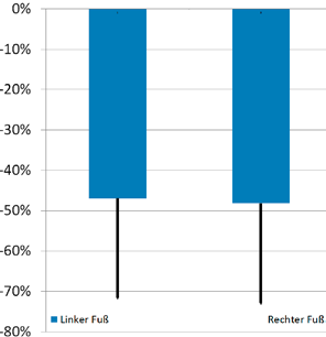 Um möglichst gleiche Bedingungen bei geradliniger Fortbewegung zu erhalten, wurde die Stützphasendauer betrachtet. Sie sollte nicht mehr als +/-10 % von der Messung im Neutralschuh abweichen. Wir betrachten alle Werte, die größer als 35N/cm² sind, als kritisch. Eine Druckreduzierung des gemessenen Maximalwerts im Neutralschuh oder in der ROI um mindestens 40 % muss erreicht werden, um als erfolgreiche Versorgung bewertet zu werden. In der Auswertung erfolgt keine Mehrfachbewertung je Patient; es wird der höchste gemessene Wert berücksichtigt. Bewertet wird dabei immer der Effekt von Diabetikerschutzschuh und Fußbettung zusammen 13 14. Eine Trennung im Versorgungsalltag ist unter praktischen Versorgungsbedingungen momentan nicht zu realisieren.